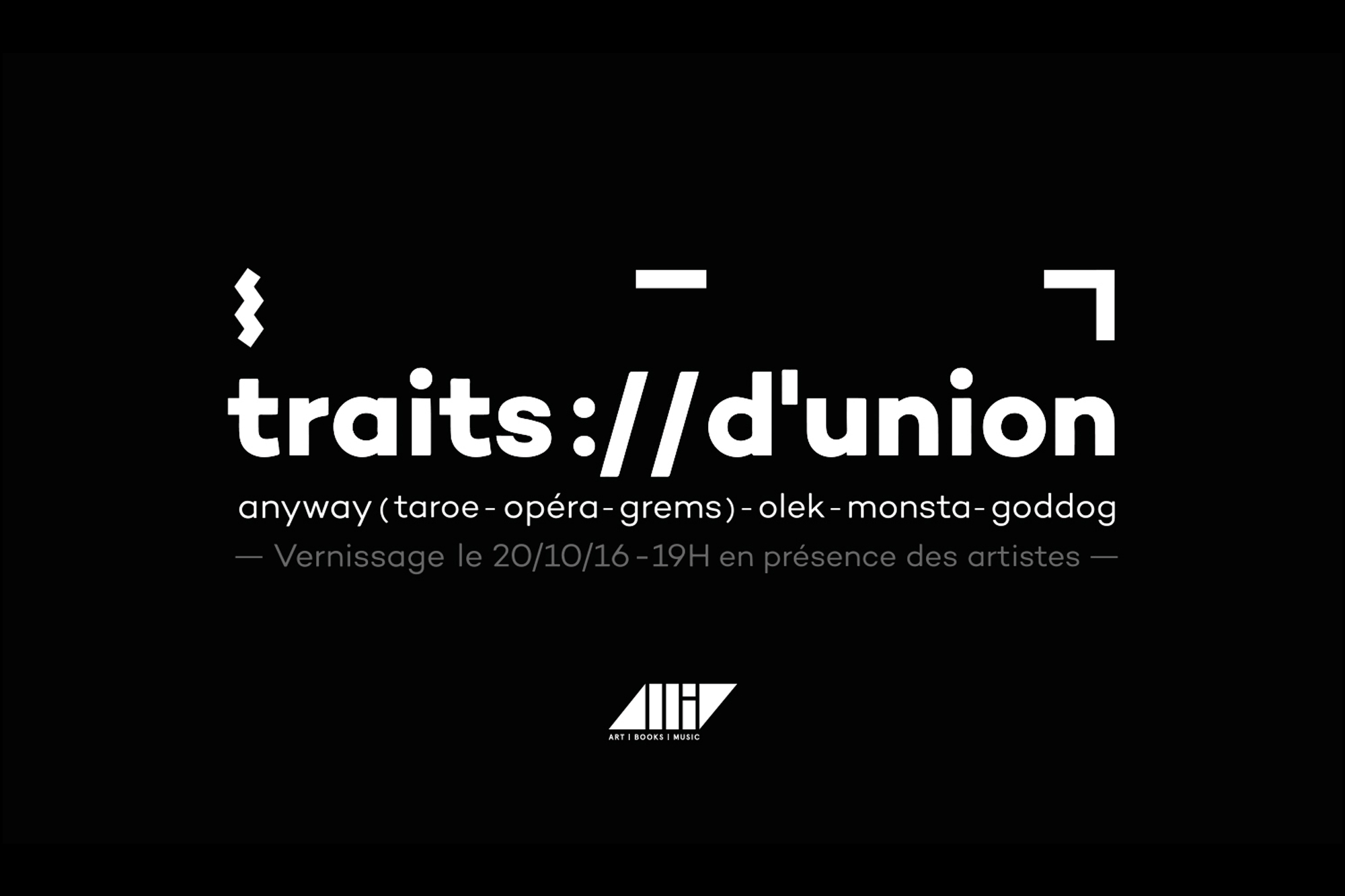 TRAITS: // D'UNION est une exposition de groupe organisée par la Villa du 20 au 2 novembre 2016. Elle réunit des artistes comme Anyway Studio (FR) mais aussi Goddog (FR) Monsta (FR) et Olek (États-Unis). Chaque artiste a pu s'emparer d'un espace et a choisi de peindre son propre monde. Le résultat nous donne une exposition collective à travers une visite dans différentes salles de la villa.